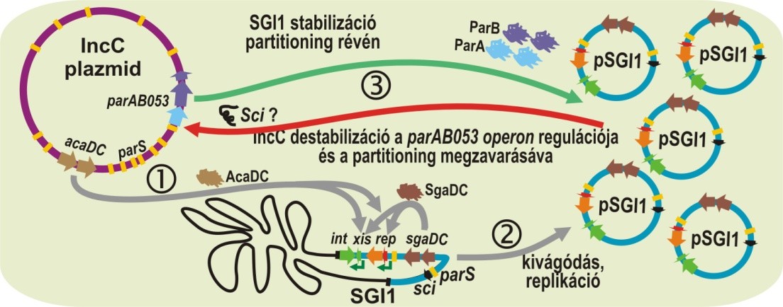 Az 1990-es években világszerte elterjedt multirezisztens Salmonella Typhimurium törzsekben azonosított SGI1, egy un. integratív mobilizálható elem, amely kiváló modellje a mobilis genomi szigetek kutatásának. Az SGI1 és variánsai mára számos patogén Salmonella szerovariánsban, valamint Proteus, Acinetobacter és Morganella törzsekben megjelentek, így komoly humán- és állategészségügyi kockázatot jelentenek. Kutatásaink az SGI1 terjedési mechanizmusaira (helyspecifikus rekombináció, konjugáció, replikáció), az IncC plazmidokkal való kooperációjára (konjugatív mobilizáció, inkompatibilitás), valamint a sziget evolúciójára (variánsok keletkezése) irányulnak.